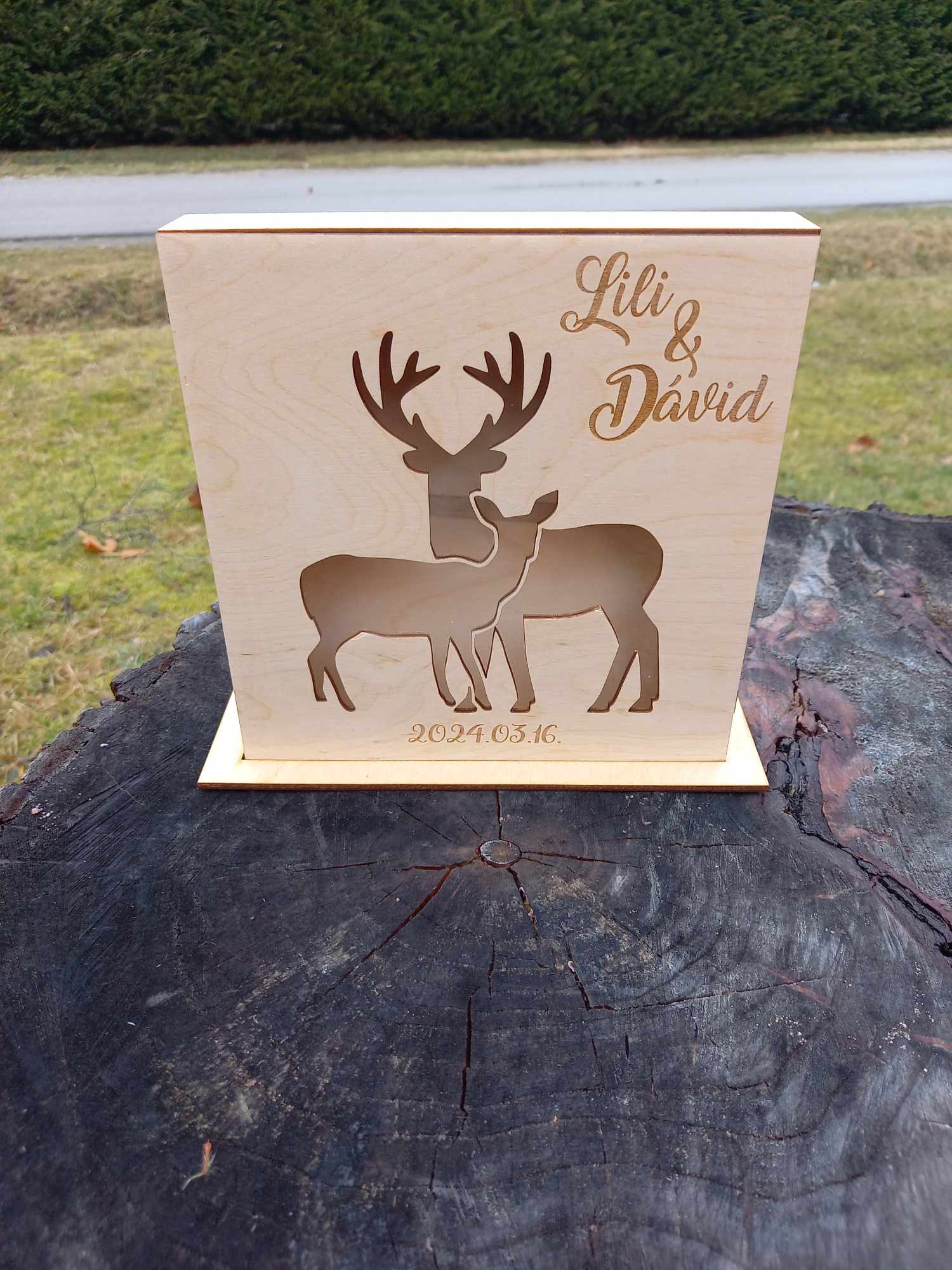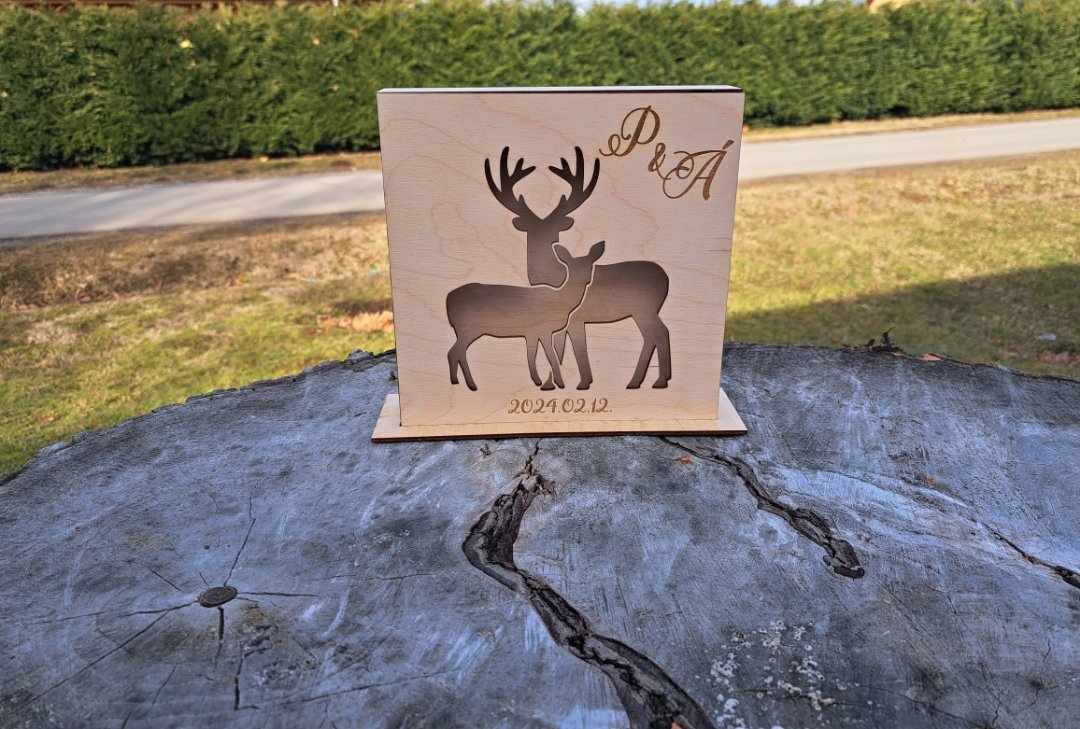 A doboz mérete 20×20 centiméter, így könnyen beleilleszthető a ceremóniaterem vagy a kert dekorációjába. Választhatod a festett változatot, mely harmonizál az esküvői színsémával, vagy a natúr változatot, amely időtlen eleganciát sugall.